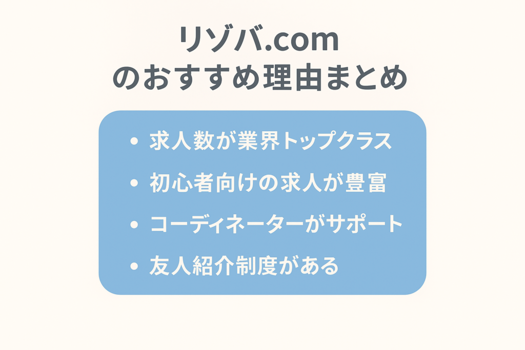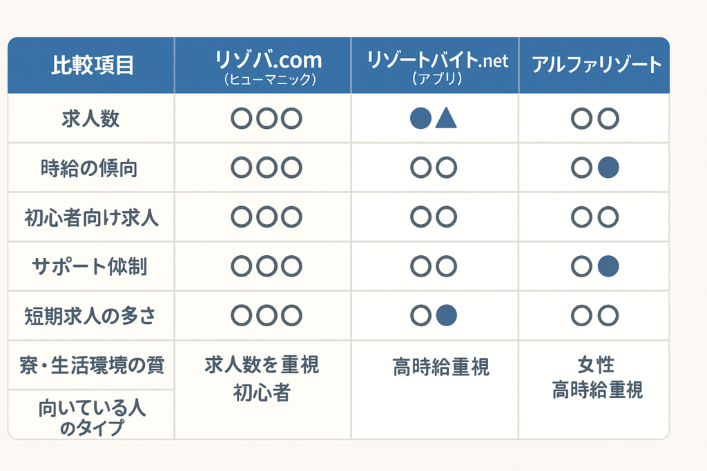 リゾバ.comは総合力が高いサービスですが、他社と比較することで“強みと弱み”がより明確になります。